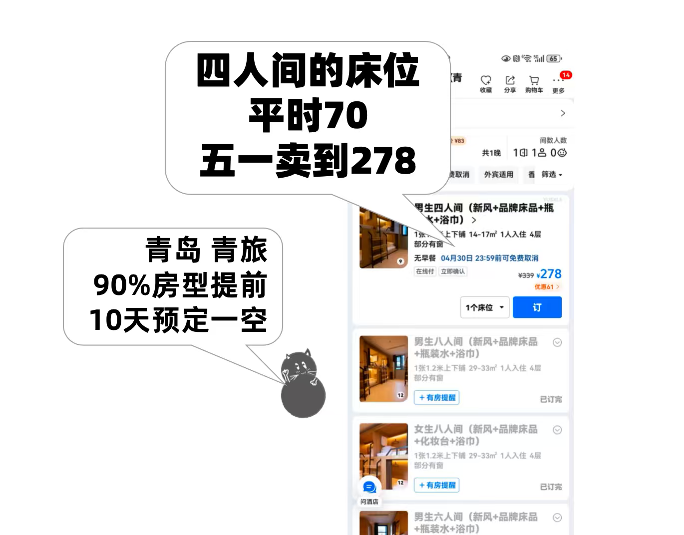 最离谱的是青旅,肤浅床位从 60元暴涨至 250+ 元,要知谈那关联词一个床位,八东谈主间呀!全网全线售罄,根柢不愁卖。