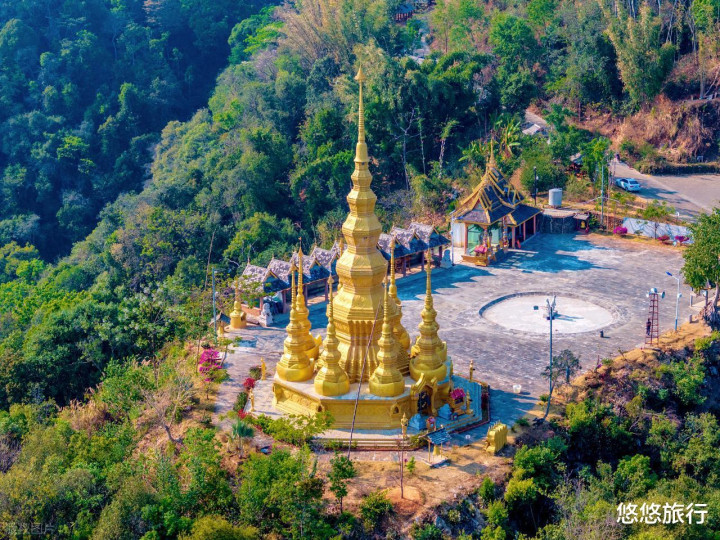 大平掌古茶林,古茶树刚劲挺拔。大金塔鎏金塔身映着蓝天,附进绿植常青。芒洪寨子位置相比高,早晨常见云海,俯视整座古寨在晨雾中苏醒。