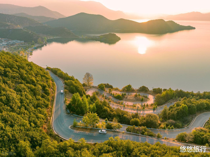 里格半岛不雅景台,能拍到心形湖湾。草海走婚桥,金黄草海和碧蓝湖水撞色。女神湾日落,群山反照在镜面湖上,薄暮色泽柔得像油画滤镜。