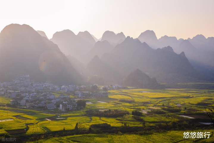 1月下旬至3月中上旬,兴义的油菜花海一派金黄,花期早,捏续期间长,实在填满了万峰林之间的闲隙。