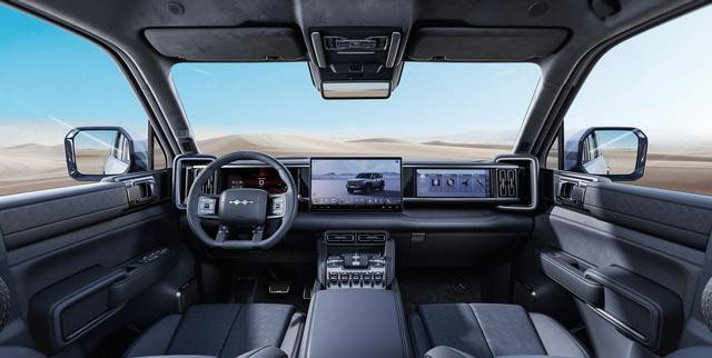 外不雅采“豹力好意思学”,正直车身配直接线条、了得轮眉及锁扣元素、外挂备胎,尽显硬派越野风。车身尺寸4890x1970x1920mm,轴距2800mm,性能超卓。车内硬朗,方块面板为主,中控配四辐标的盘、双大屏及50寸HUD,相沿多项智能功能。