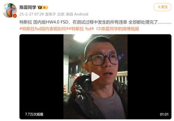 陈震:特斯拉FSD测试7个违法已惩处完 车主是第一包袱东说念主