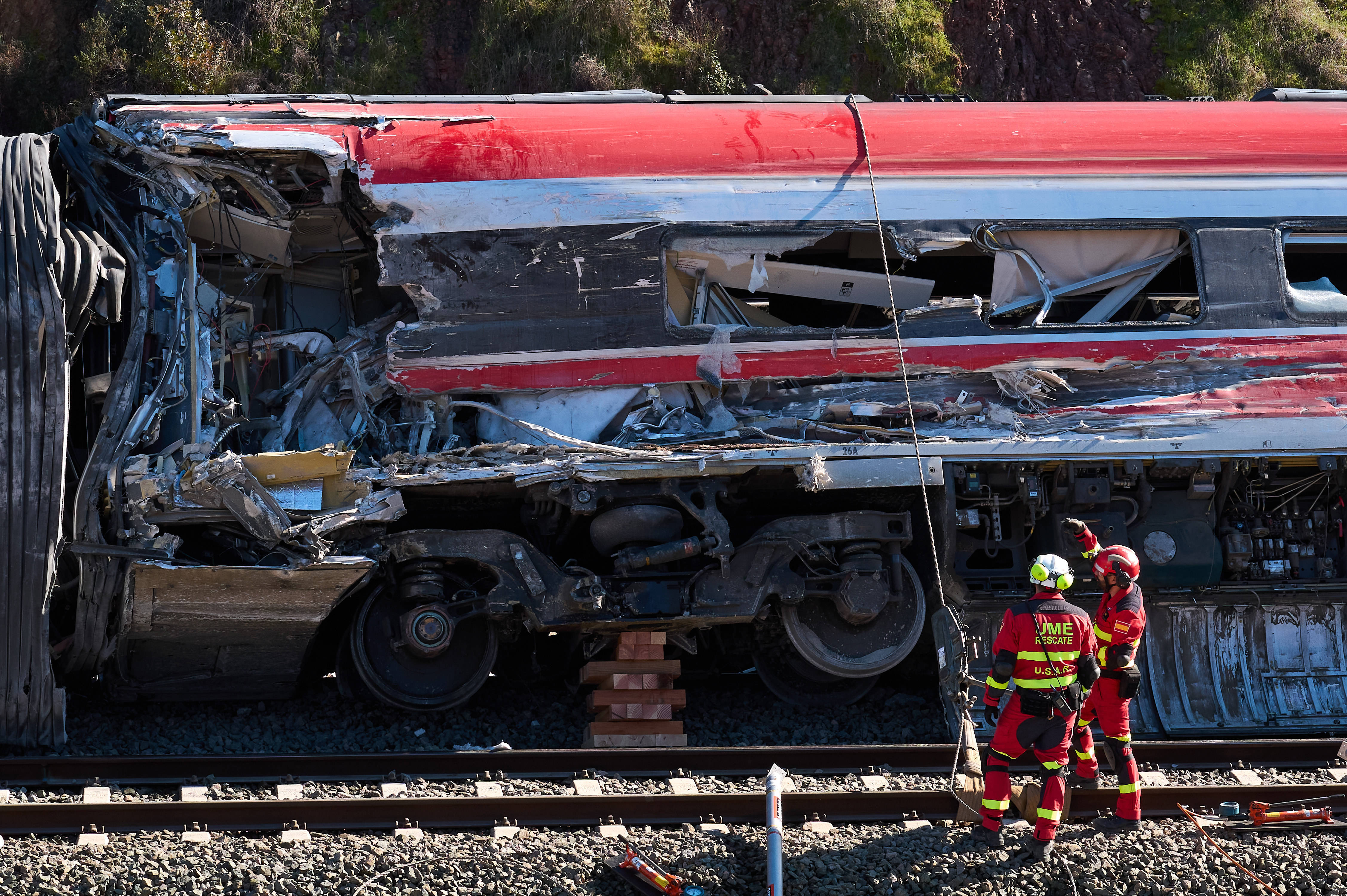 1月20日,救助东谈主员在西班牙科尔多瓦省阿达穆斯镇的高铁事故现场责任。新华社记者孟鼎博摄据西班牙媒体报谈,探望知道,事故现场轨谈出现杰出30厘米的罅隙,可能是焊合不妥或使用磨损所致。西班牙交通大臣奥斯卡·普恩特则说,相干轨谈客岁5月翻修,坚称“所用材料均相宜活动”,探望效果将给以考据。
