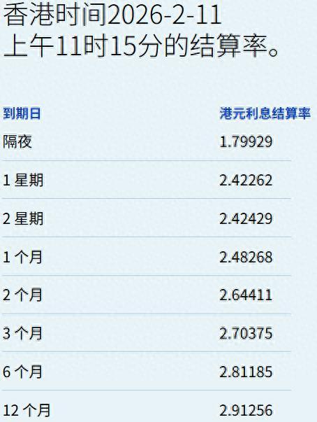 智通财经APP获悉,2月11日,港元拆息多数向下,而与楼按关连的一个月拆息报2.48268%,见逾两个月低位,跌2.178基点;反应银行资金资本的三个月拆息报2.70375%,跌2.988基点。
