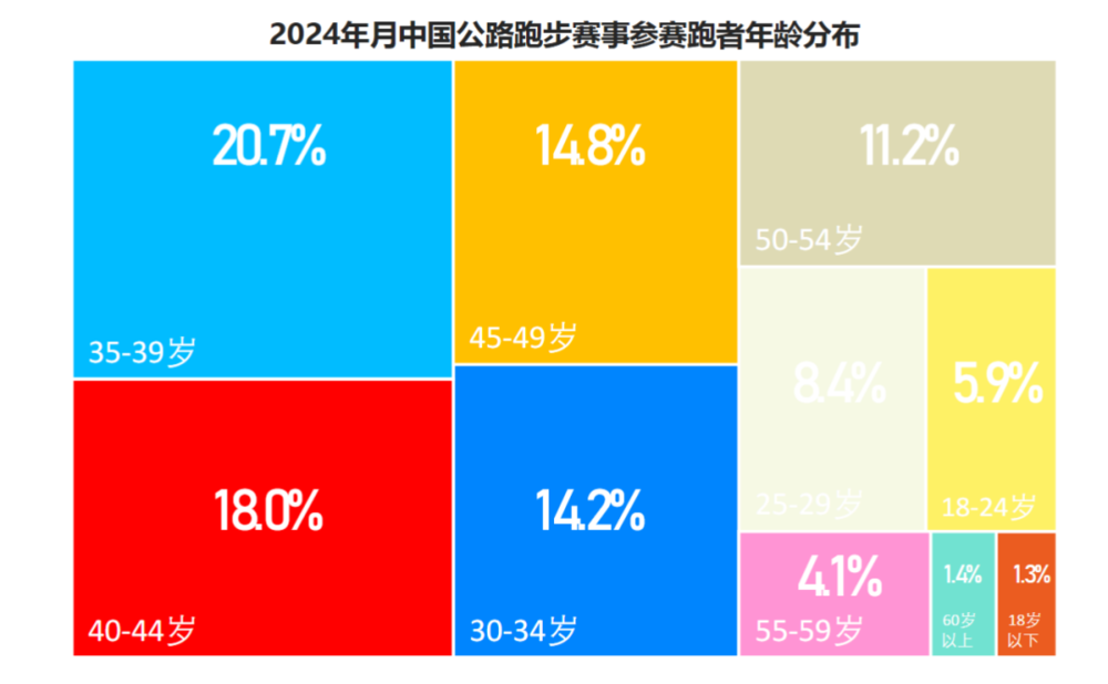 在极数发布的《中国公路跑步赛事白皮书2025》中,给出了这样一组兴味兴味的东说念主群画像:最多的东说念主群为35~39岁占20.7%,40~44岁占18%,45~49岁占14.8%,50~54岁占11.2%,55~59岁占4.1%;